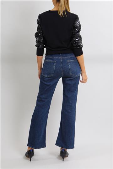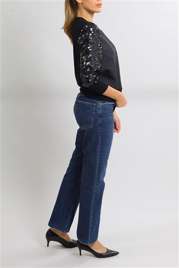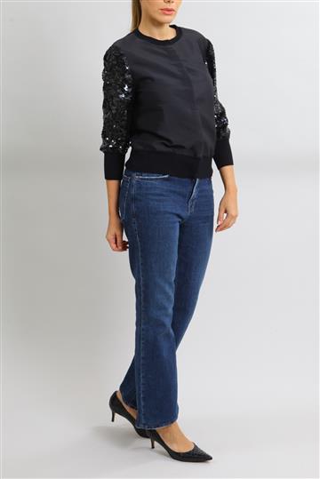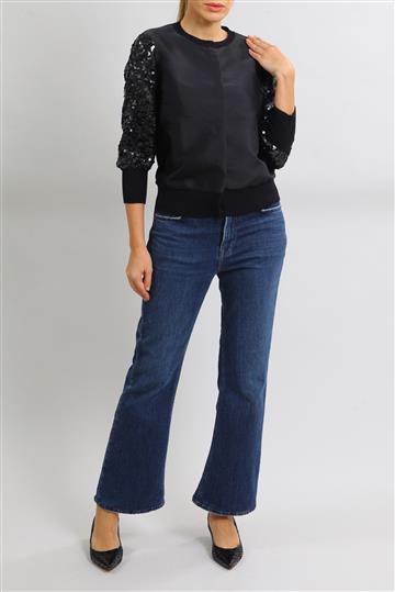 - Mangas 3/4 bufantes inteiramente revestidas por paetês