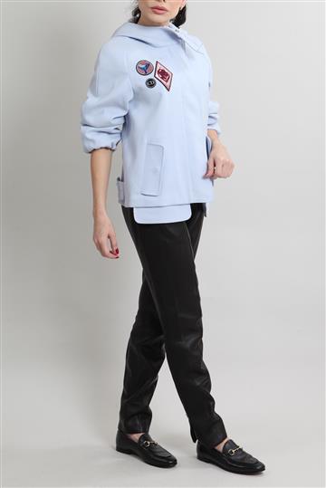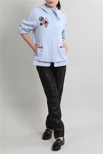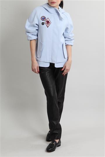 - Patches decorativos com paetês e bordados aplicados ao colo