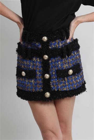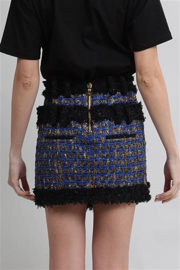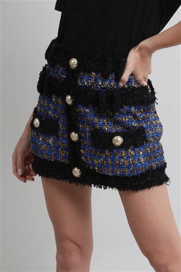 - Saia em tweed encorpado e texturizado com fios de lurex aplicados à trama