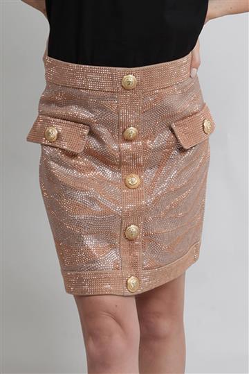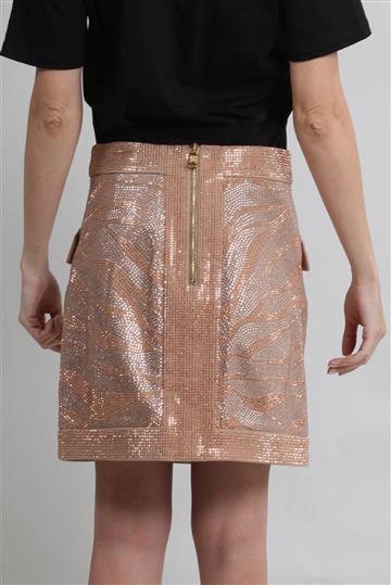 - Saia em tecido sarjado e encorpado com strass aplicados