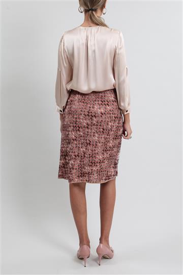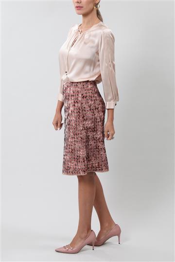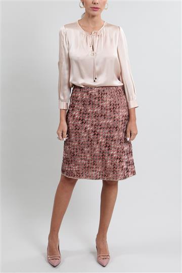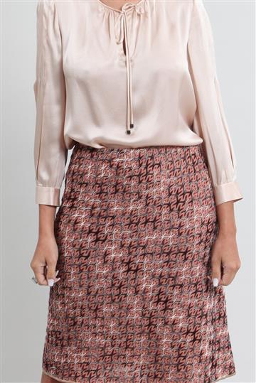 - Saia de tricot- Bege, laranja, branco e preto- Curto- Elástico na cintura