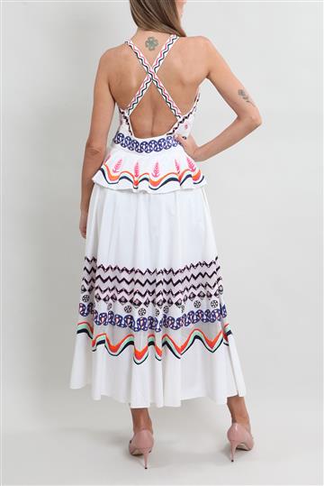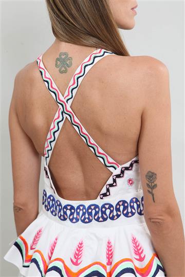 - Decote arredondado alto com alças medianas cruzadas nas costas