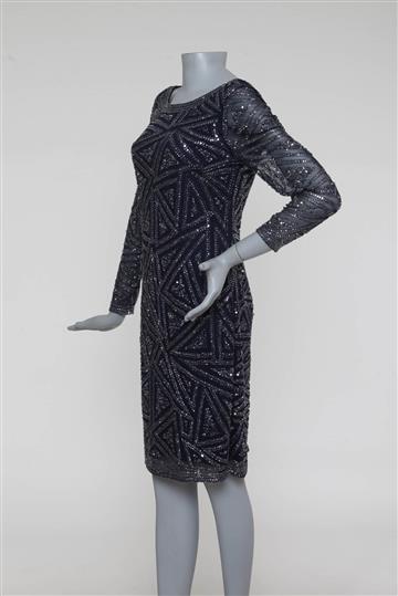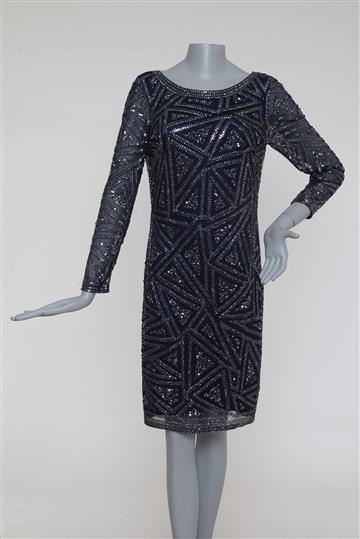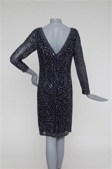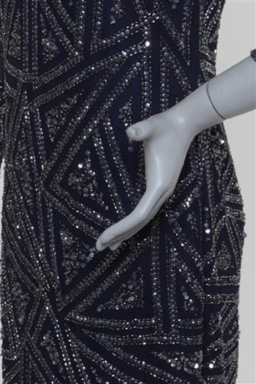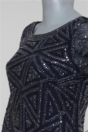 - Bordados geométricos com paetês e pequenos canutilhos aplicados