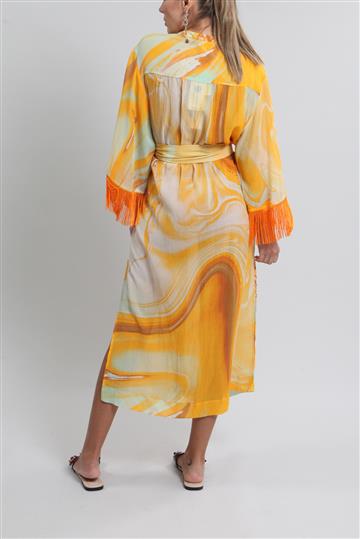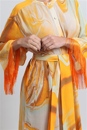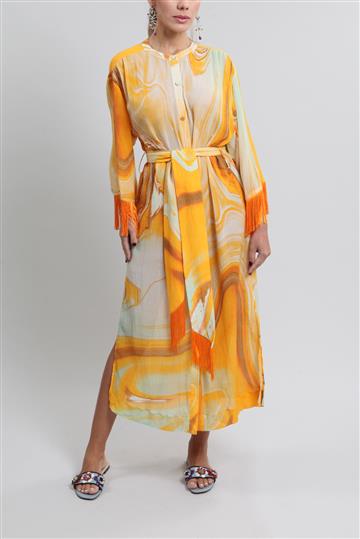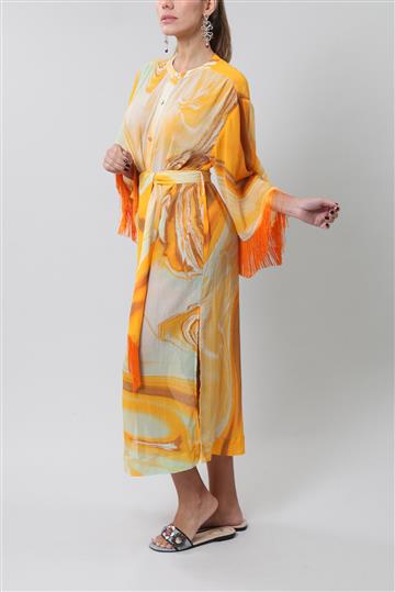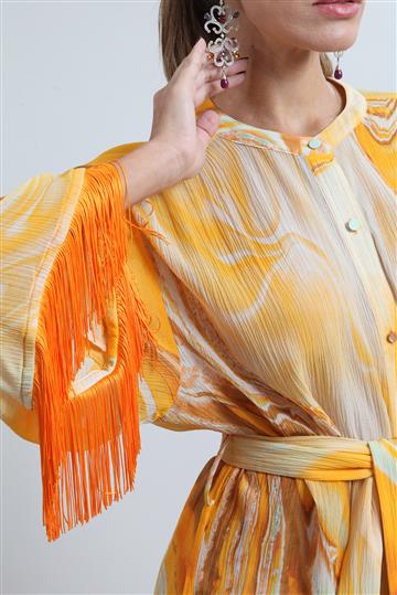 - Mangas 3/4 retas e amplas com franjas aplicadas aos punhos