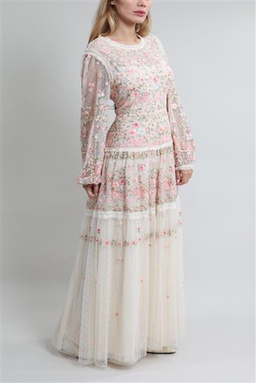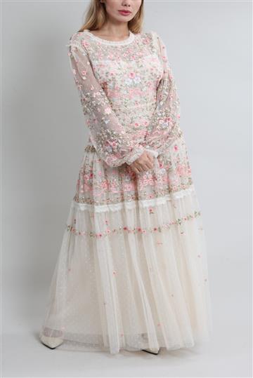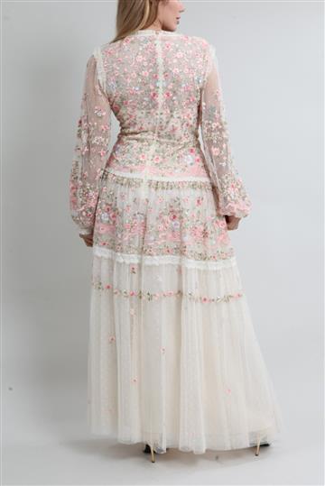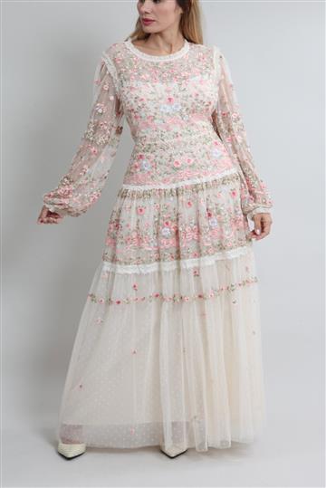 - Vestido em tule bordado de caimento leve e fluido
