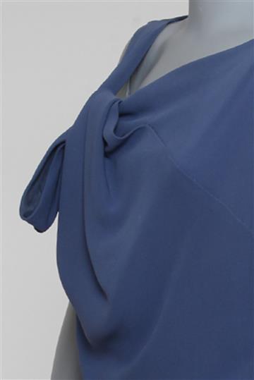 - Decote arredondado com detalhe drapeado aplicado ao busto