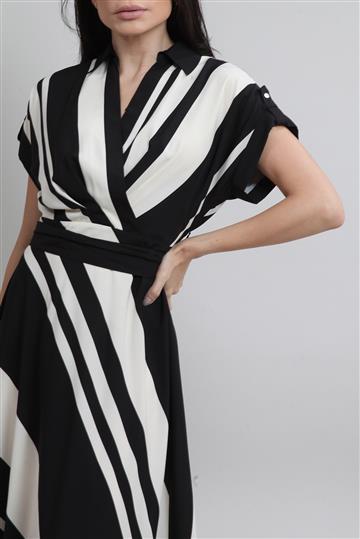 - Decote alongado e transpassado em 'V' com gola de pontas clássica