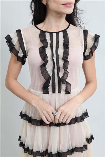 - Fechamento posterior por zíper aplicado e abotoamento delicado