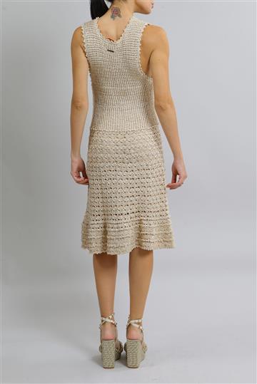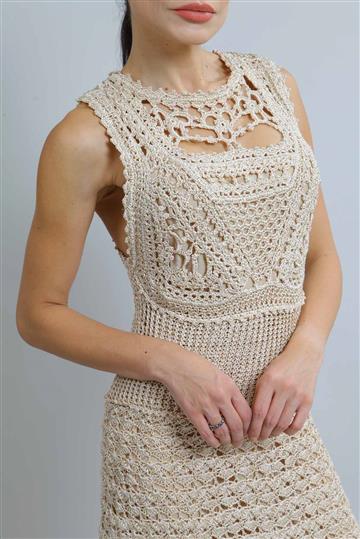 - Vestido em crochê encorpado com fios de lurex aplicados à trama