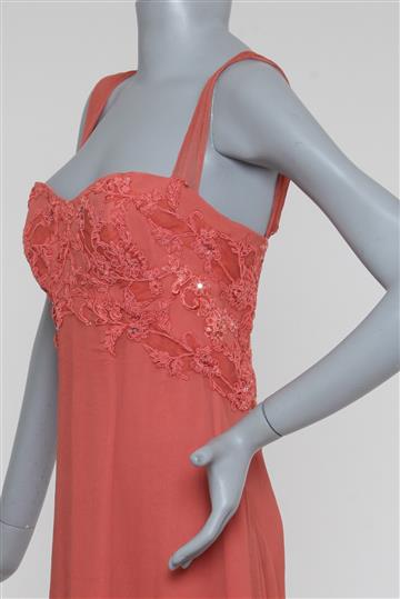 - Bordados decorativos de temática floral com pequenos paetês aplicados