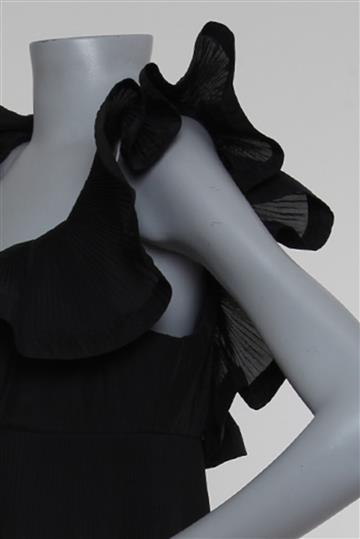 - Alças superiores com babados amplos aplicados