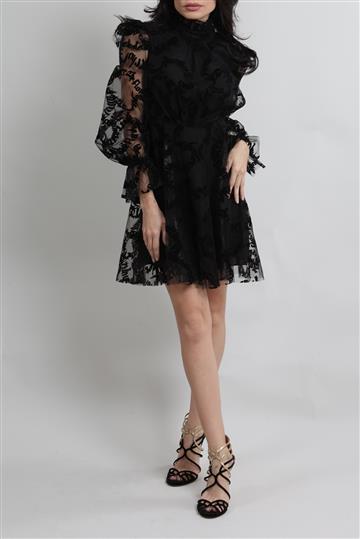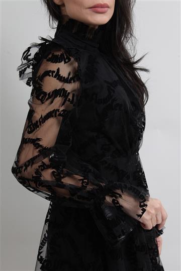 - Vestido em tule encorpado com detalhes em veludo