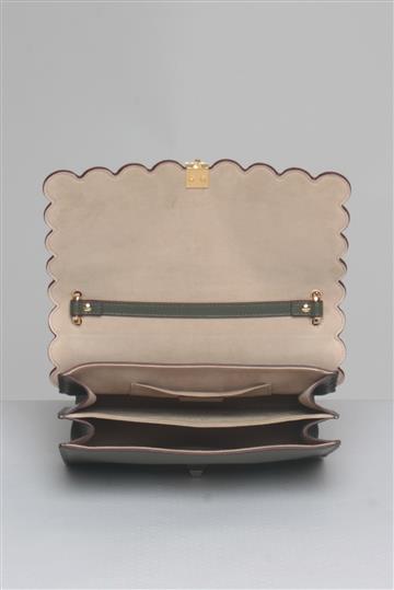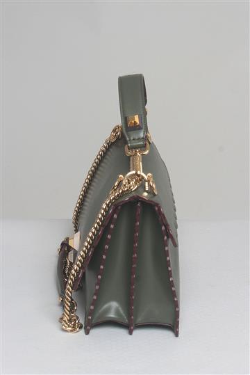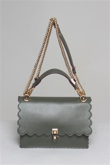 - Alça alongada composta por corrente metálica e ombreira em couro
